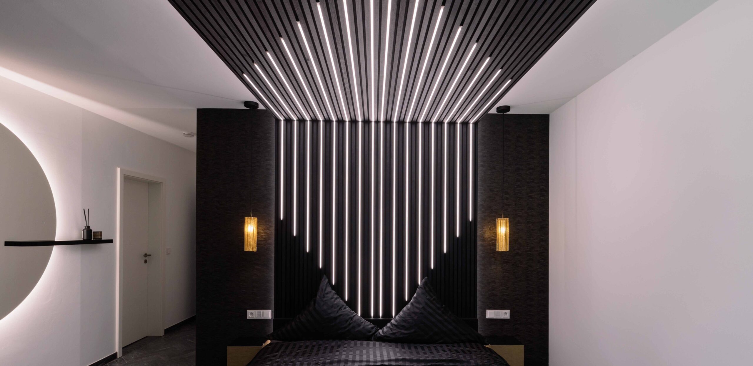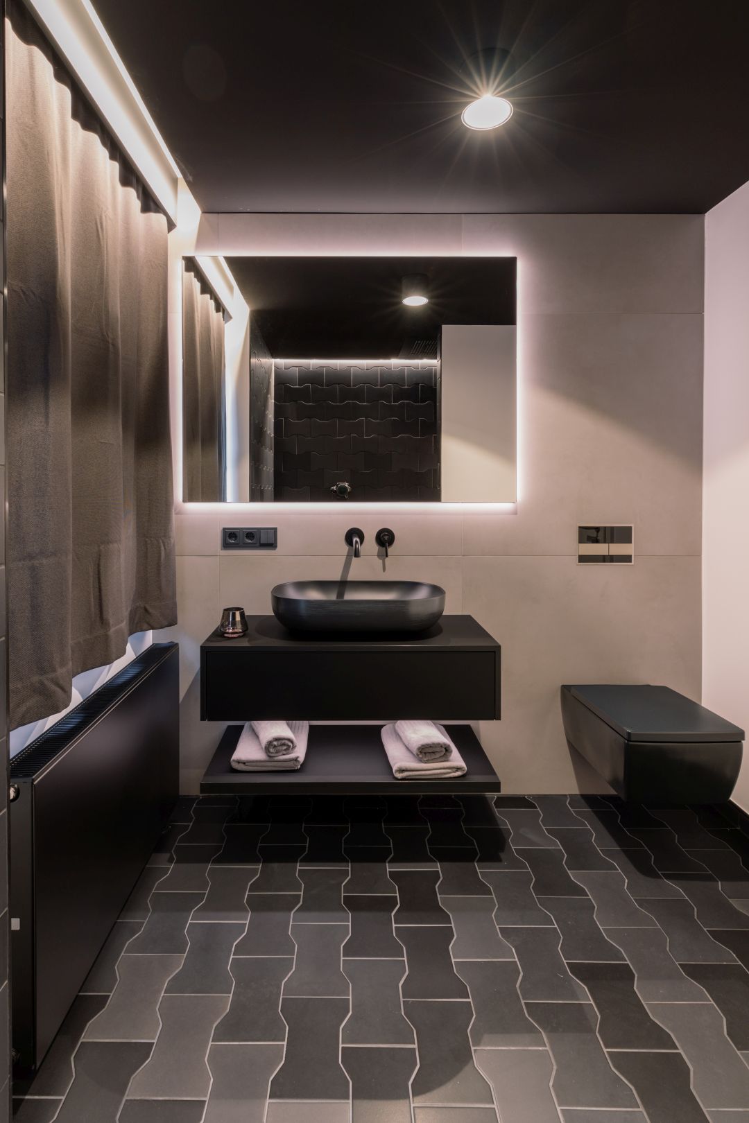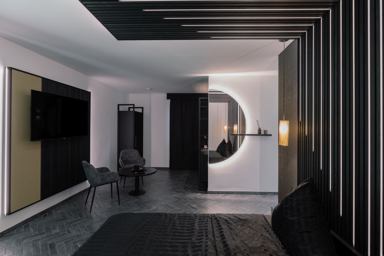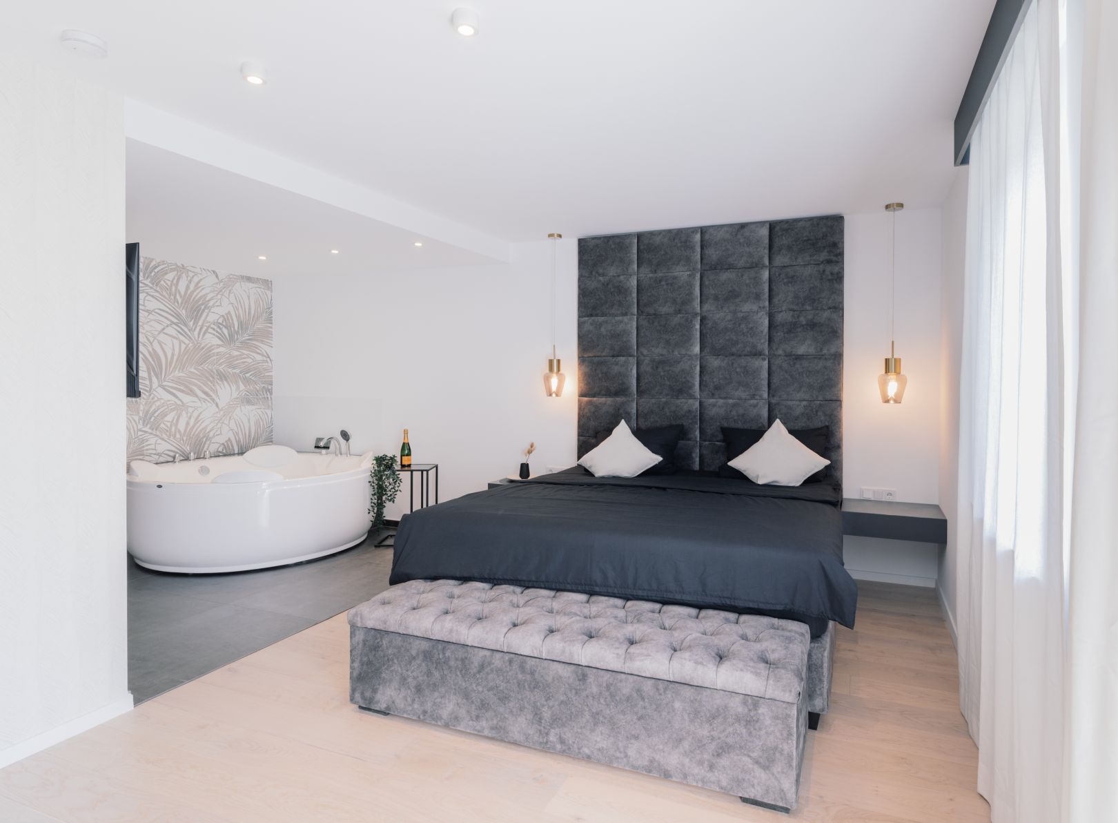 Ein eleganter Rückzugsort mit höchstem Wohlfühlfaktor: Genießen Sie die perfekte Verbindung von Komfort und Stil in unserem Schwarz-Weiß-Zimmer im ersten Obergeschoss.