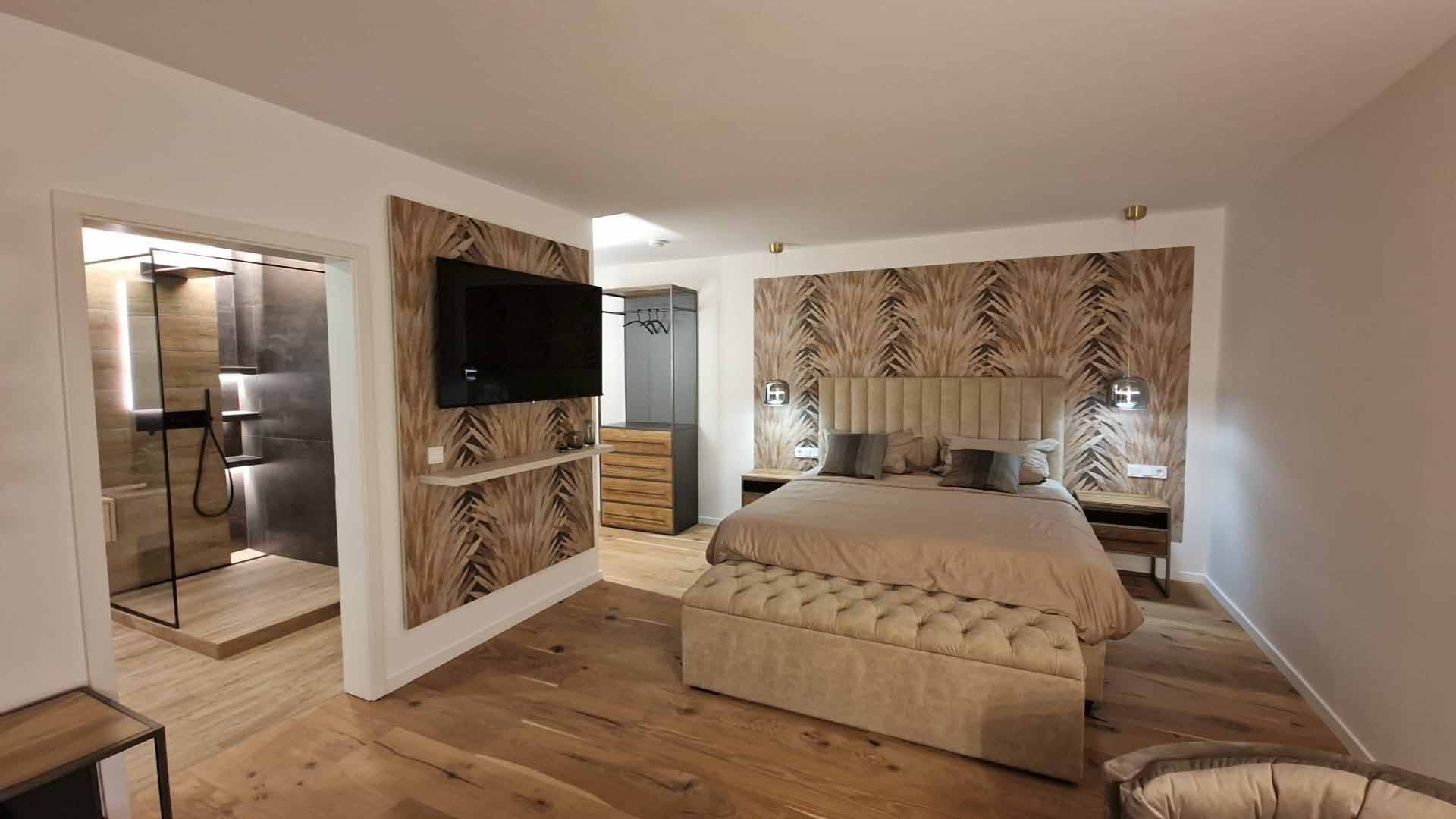 Erleben Sie pure Eleganz und modernen Komfort in unseren individuell gestalteten Zimmern. Hochwertige Materialien, harmonische Farben und stilvolle Details schaffen eine Atmosphäre zum Wohlfühlen und Entspannen. Für ein unvergleichliches Wohlfühlerlebnis erwartet Sie unsere exklusive Wellness-Suite mit privater Sauna und Whirlpool – perfekt für eine erholsame Auszeit vom Alltag.